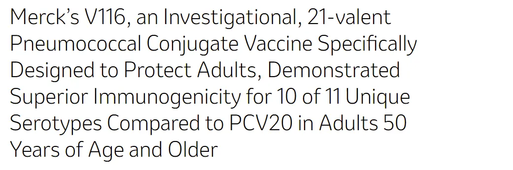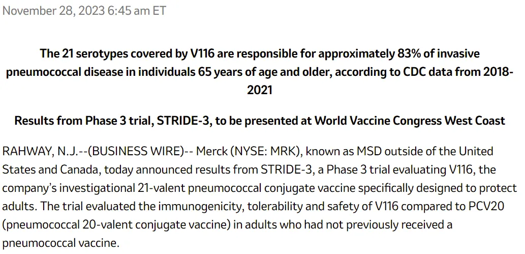 2023年11月28日,默沙东公布21价肺炎多糖结合疫苗V116三期临床STRIDE-3的最新数据。