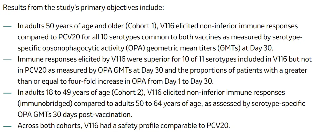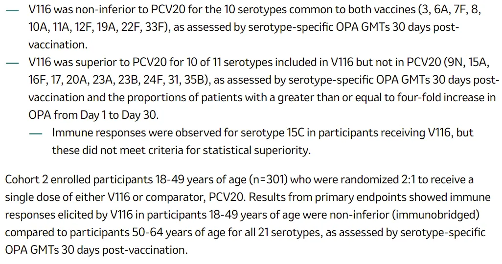 该三期临床STRIDE-3入组2663例受试者,随机接种V116或辉瑞Prevnar 20,结果表明,对于50岁以上人群,对于10种共同的血清型(3、6A、7F、8、10A、11A、12F、19A、22F、33F),V116免疫响应(OPA GMTs)非劣效与Prevnar 20,对于V116特有的11种血清型,10种都表现出优效(9N、15A、16F、17、20A、23A、23B、24F、31、35B),只有15C观察到免疫响应但未达到显著差异的优效标准。队列二18-49岁人群,所有21种血清型都达到非劣效。