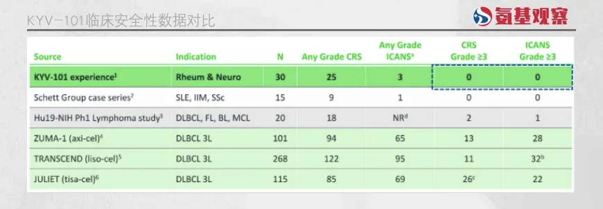 如下图所示,KYV-101的整体安全性数据显著优于肿瘤治疗中的临床数据。这可能进一步证实了,与肿瘤学中CAR-T疗法相关的典型安全问题在自免患者中并不常见。