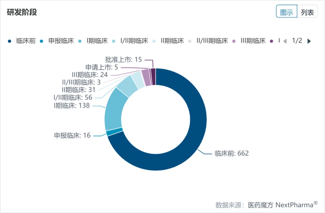 根据医药魔方数据库,全球共有950个处于活跃状态的ADC在研项目,其中近70%为临床前开发阶段,意味着大量积蓄的创新力量有待释放。