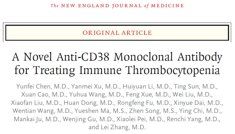 2024年6月19日,新英格兰医学期刊发表了康诺亚CD38抗体CM313治疗原发免疫性血小板减少症(ITP)的1/2期临床数据。