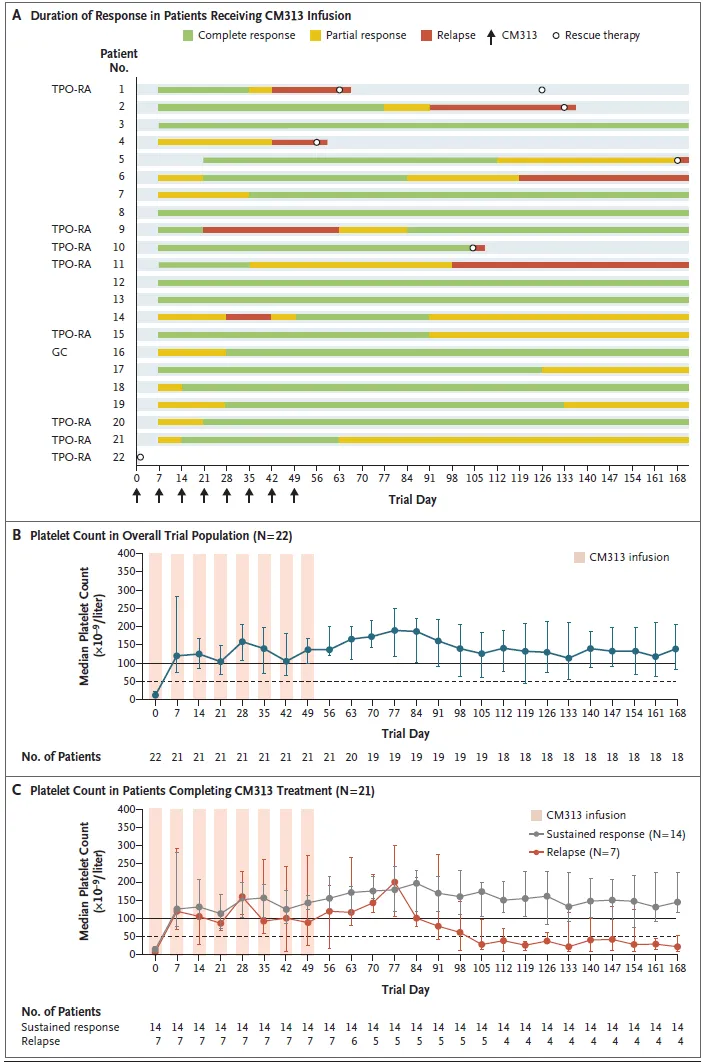 该研究入组22例ITP患者,除1例患者首次给药后脱落,其余21例患者均完成了8 次给药和16周的随访。在疗效上,95.5%的患者(21/22)在首次接受CM313给药后 8周内达到血小板计数≥50 × 10^9/L,血小板计数持续≥50 × 10^9 /L的中位累积时间为23周,至首次血小板计数≥50 × 10^9 /L的中位时间为1周,至首次血小板计数≥30 × 10^9 /L且较基线增加≥2倍的中位时间为1周,持久血小板响应率为63.6%(14/22)。21例患者在整个研究期间达到总体缓解(完全或部分缓解),其中20例患者达到完全缓解。基线时,68.2%患者(15/22)报告出现出血症状。在第8周,出现出血症状的患者比例降至4.8%(1/21)。大多数因CM313治疗后血小板计数恢复正常或安全水平而停用伴随药物。总之,CM313在95.5%的既往接受过多种治疗的ITP患者中表现出快速且持续的疗效反应。