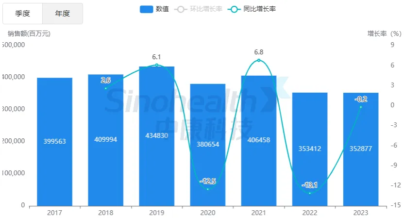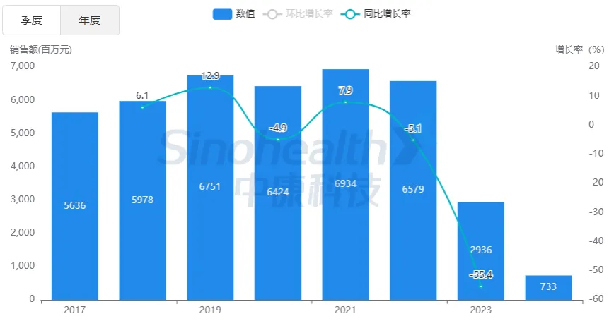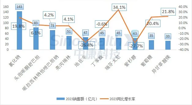 在2023年全国等级医院化药注射剂的销售额TOP10排行榜中,所有药物销售额均破30亿元,其中刷新往年销售记录的产品就多达7款。如氯化钠已连续7年超110亿元,2023年更破新高位居榜首,约143亿元。