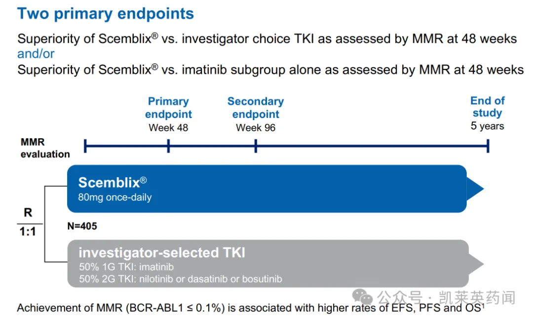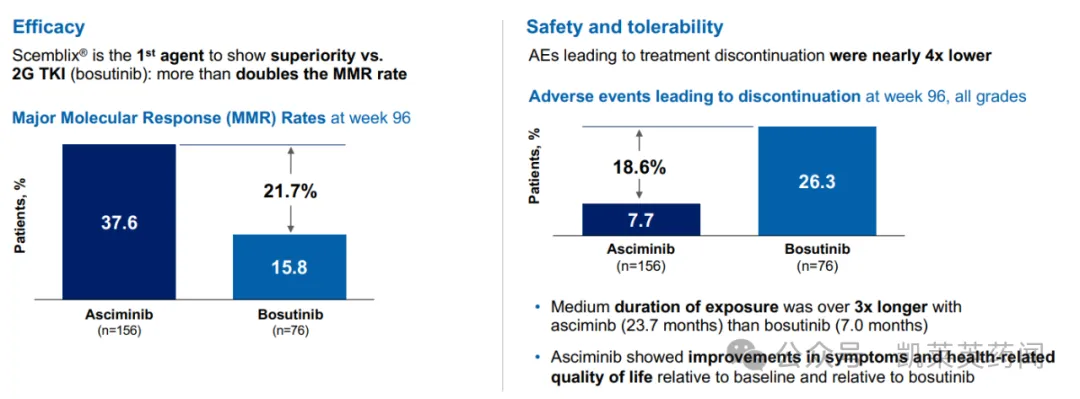 结果显示:研究达到双重主要终点,Scemblix第48周的MMR率优于研究者选择的TKIs(伊马替尼、尼洛替尼、达沙替尼和博舒替尼),具有临床意义和统计学意义。同时,Scemblix也表现出良好的安全性和耐受性,不良事件(AE)和治疗中断情况更少,没有观察到新的安全信号。