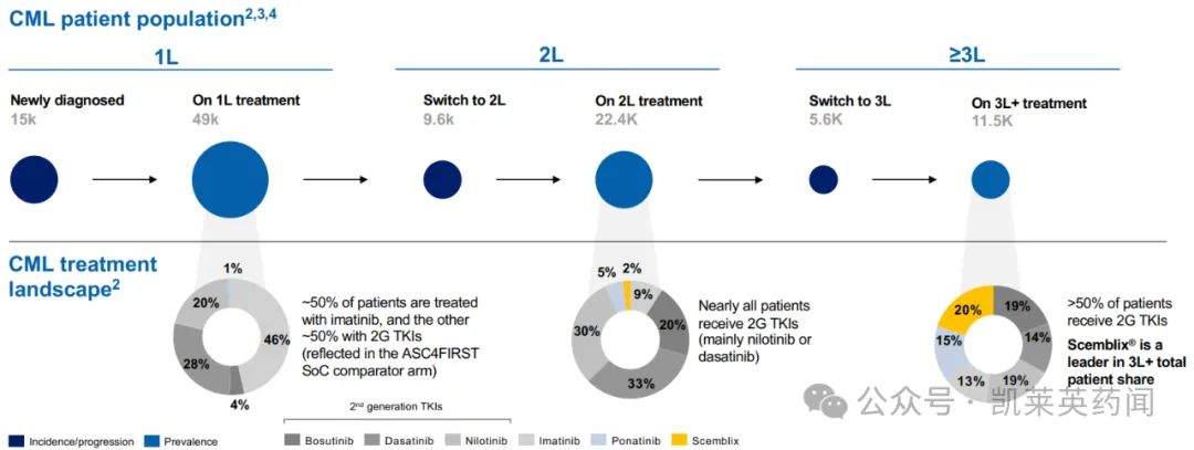 2024年1月,公司在新诊断的费城染色体阳性慢性髓性白血病慢性期(Ph+ CML-CP)成年患者的III期ASC4FIRST研究初步分析中取得积极结果;该研究是一项随机、多中心、开放标签的III期临床试验,也是首个且唯一一个与标准治疗CML的一代、二代TKI进行头对头的III期试验;主要终点包括48周时,与研究者选择的二代TKI(尼洛替尼、达沙替尼和博舒替尼)以及伊马替尼相比,每日1次80mg Scemblix治疗组达到MMR的患者比例。