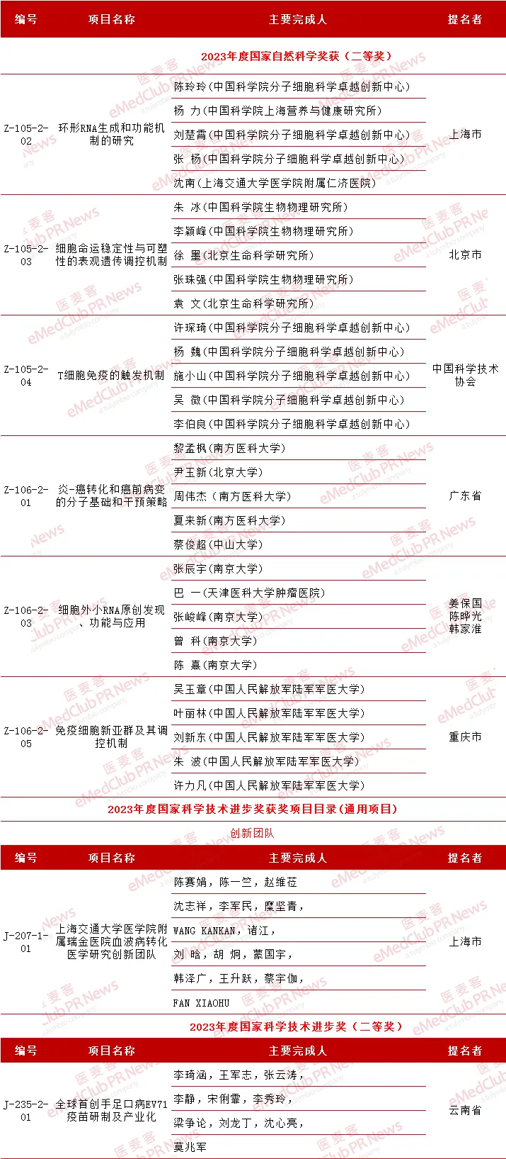 6月24日,2023年国家科学技术进步奖公布,多个与生物创新药相关的项目脱颖而出。这些项目涵盖了环形RNA研究、细胞命运调控、T细胞免疫机制、炎症与癌症转化、血波病转化医学研究、细胞外小RNA的发现与应用、免疫细胞新亚群研究,以及手足口病疫苗的研制等多个方面,展现了我国在生物医药领域的创新能力和科研实力。