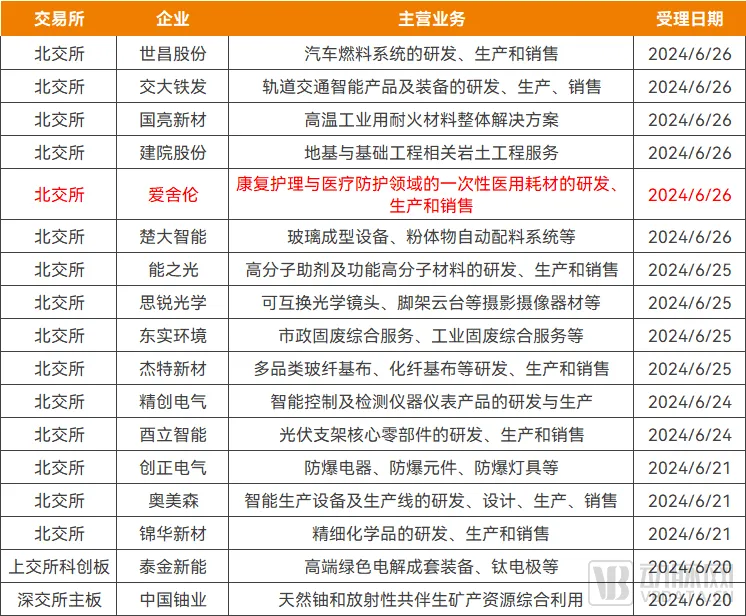 值得欣喜的是,在IPO受理恢复一周的首批企业中,已经出现了医疗健康企业的身影,即6月26日爱舍伦在北交所的IPO申请已变更为受理状态。爱舍伦主要从事应用在专业康复护理与医疗防护领域的一次性医用耗材的研发、生产和销售,2023年公司营业收入5.75亿元。