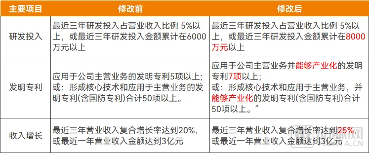 只是在另一方面,上述措施发布半个月后,《关于修改〈科创属性评价指引(试行)〉的决定》发布,提高了对拟上市企业在研发投入、发明专利数量及营业收入复合增长率方面的要求。