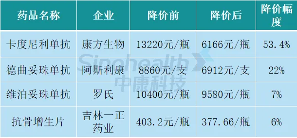 据新康界统计,进入6月,已有不少未进医保的药品主动申请降价,包括卡度尼利单抗、德曲妥珠单抗、维泊妥珠单抗、抗骨增生片等品种,降幅分别达到53.4%、22%、7%、6%。