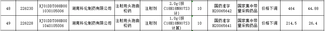 值得一提的是,湖南科伦制药是此次降幅最为明显的企业。其上榜的注射用头孢曲松钠本身已是医保产品,价格从464元/2g下调至44.88元/2g、214.5元/1g下调至26.4元/1g,分别降幅达90%、88%。