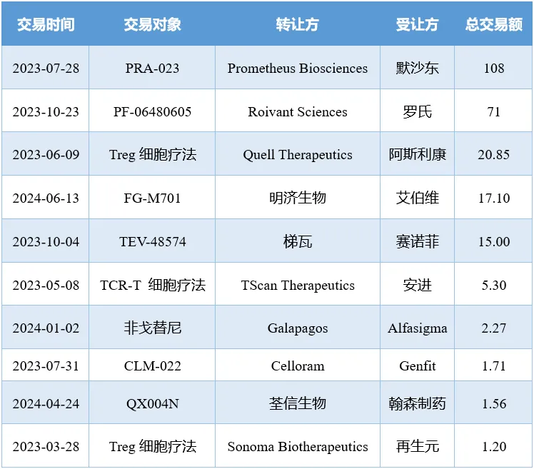 注:仅统计总交易额超1亿美元的合作/收购交易