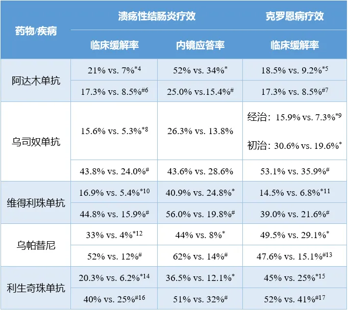 注:1)*为诱导治疗数据;#为维持治疗数据;2)除红色标注数据的对照组为乌司奴单抗外,其余研究的对照组均为安慰剂。