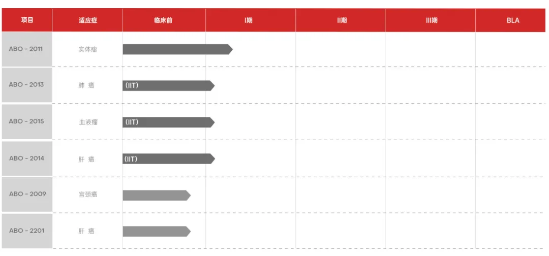 艾博生物mRNA技术应用有两条线,一是传染病防治领域,这个领域除了新冠疫苗外到目前再无新的管线进入临床;二是肿瘤领域,2023-2024年公司唯一在药品审评中心备案受理临床的品种只有一款ABO-2011,其余显示进入临床的均为研究者发起的ITT试验。