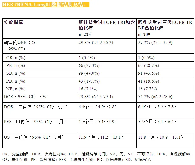 经盲法独立中心(BICR)评估,在225例EGFR突变的NSCLC患者中,patritumab deruxtecan(5.6 mg/kg)组患者确认的客观缓解率(ORR)为29.8%(95% CI:23.9~36.2)。其中1例完全缓解(CR),66例部分缓解(PR),99例疾病稳定。中位缓解持续时间(DOR)为6.4个月(95% CI:4.9~7.8),疾病控制率(DCR)为73.8%(95% CI:67.5~79.4)。截止至2023年05月18日数据截至日期,中位无进展生存期(PFS)为5.5个月(95% CI:5.1~5.9个月),中位总生存期为11.9个月(95% CI:11.2~13.1个月)。各亚组的疗效结果一致,其中包括209名患者所在的既往接受过三代EGFR TKI和含铂化疗治疗亚组。Patritumab deruxtecan 针对不同的EGFR TKI耐药机制和不同的肿瘤HER3膜表达水平患者,均观察到抗肿瘤活性。截至2022年11月21日数据截止时,HERTHENA-Lung01临床研究中观察到patritumab deruxtecan的安全性特征与先前的临床试验一致。