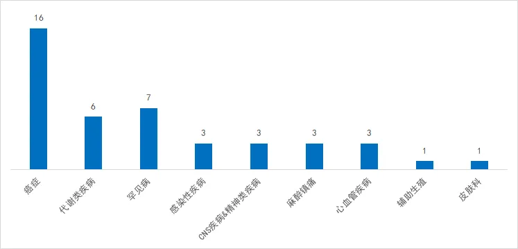 从适应症来看,首次获NMPA批准上市的新药中,抗肿瘤适应症最多,占比约为36%。其次是罕见病和代谢类疾病,占比分别为16%和14%,其中代谢类疾病中有6款新药均针对2型糖尿病。