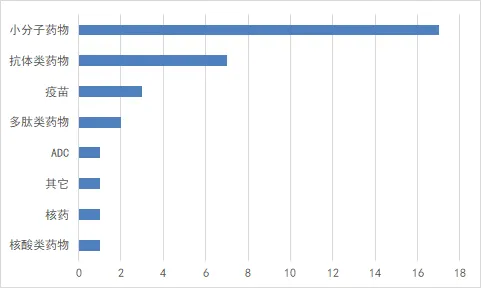 从药物类型来看,2024年上半年入选突破性治疗药物名单的41个药物呈现多样化趋势。小分子药物数量最多,占比42%(17项)。其次是抗体偶联药物(ADC),有10个。抗体类药物(含单抗、双抗)有8个,细胞和基因疗法有3个,此外还有一些核酸药物和多肽药物。