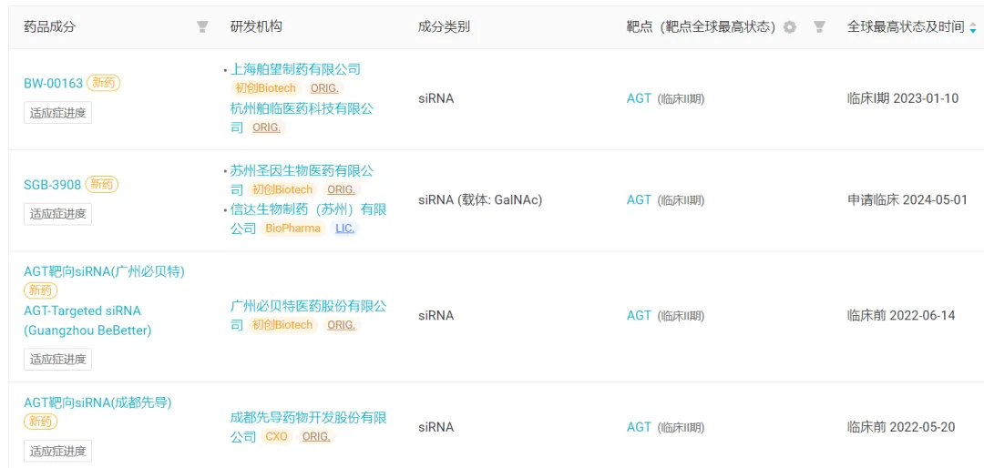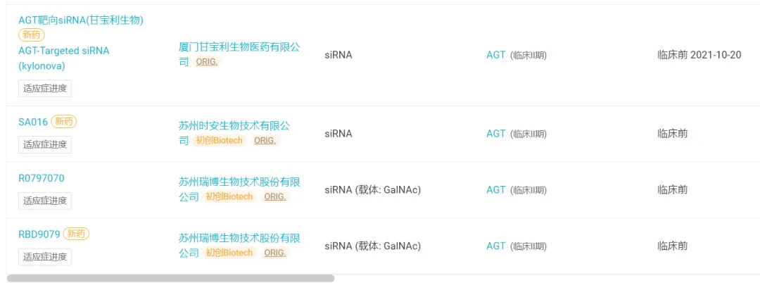 除罗氏外,也有不少中国药企布局了 AGT RNAi 药物,包括信达生物 SGB-3908、瑞博生物 RBD-9079 等,目前均处于临床早期阶段。