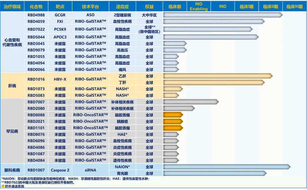 国内知名小核酸药企瑞博生物、舶望制药,除了布局多款针对罕见病的管线外,还涉及心血管和代谢性疾病。