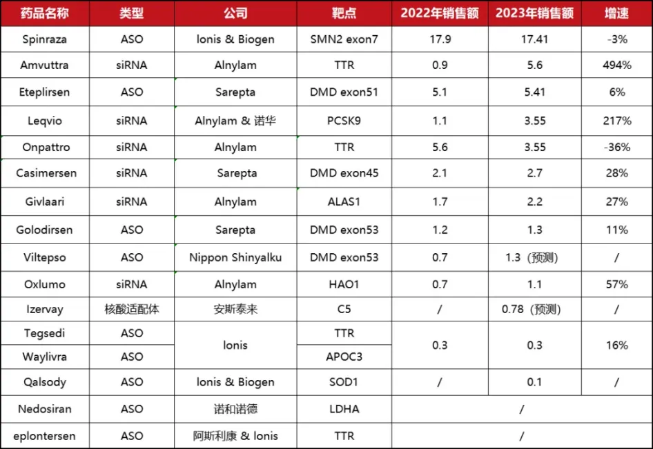 尽管在罕见病领域,已诞生了累计销售额超百亿美元的「药王」——由 Ionis 和 Biogen(渤健)合作研发的 Spinraza(nusinersen,诺西那生钠),2022 年、2023 年全球销售额分别达到 17.94 亿美元、17.41 亿美元,但这并不是小核酸药物的终点。