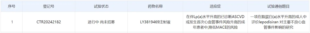 中国药物临床试验登记与信息公示平台最新公示显示,礼来公司(Eli Lilly and Company)已经启动了一项lepodisiran(LY3819469)的国际多中心(含中国)3期临床研究,适应症为:在伴脂蛋白(a)水平升高的已诊断动脉粥样硬化性心血管疾病(ASCVD)或发生首次心血管事件风险升高的成年患者中评估lepodisiran降低主要不良心血管事件(MACE)风险。该研究拟在中国境内入组700人,在国际范围内入组12500人。在给药方式上,lepodisiran为400mg皮下注射,每6个月注射一次。