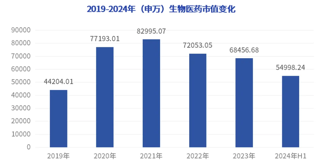 2021年至2024年H1,申万生物医药总市值下降趋势明显,2021年行业市值峰值最高达82995.07亿元,而2024年行业市值却仅剩54998.24亿元,一年时间「生物医药」市值缩水1.3W亿元。