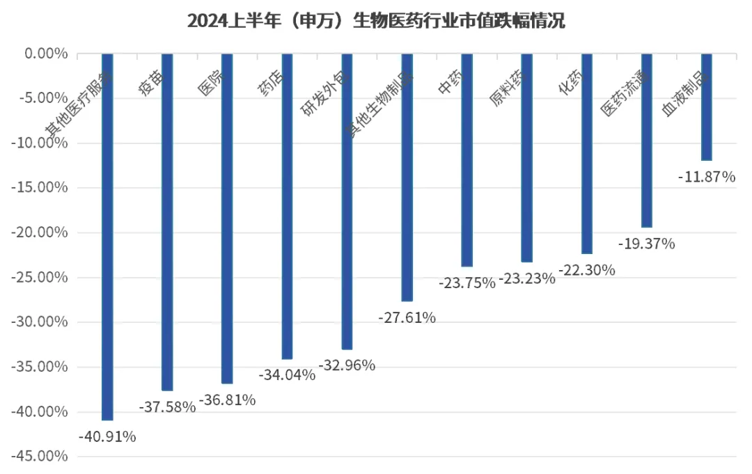 而细节上看,2024年H1生物医药(除器械外)全行业市值均呈现「负增长」趋势,除开诊断试剂、药店与医院的影响,疫苗与CXO行业或许才是2024上半年比惨大会真正意义上的“胜者”。不过,几乎全军覆没的行情之外,仍有35家企业逆势增长,主要分布在化药、中药、生物制品与医药服务四大领域,均为各自领域中尤为珍贵的存在。