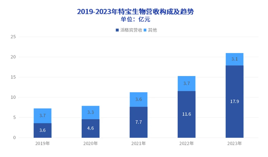 作为“大单品为王”的生物制品领域,特宝生物市值增长绕不开也正是其乙肝的生物制品“派格宾”的业绩,从2019年的3.6亿增长到2023年的17.9亿元,放在整个医药行业都是足够亮眼。