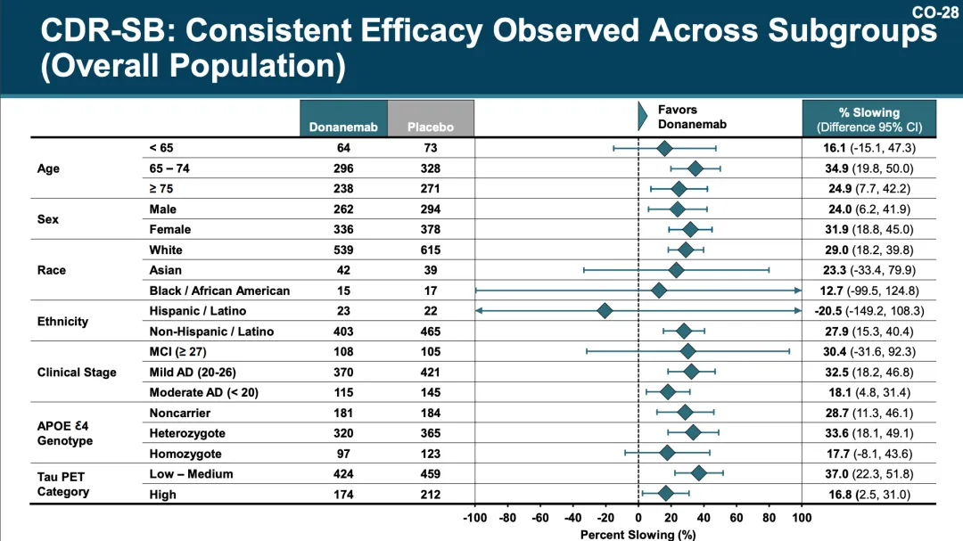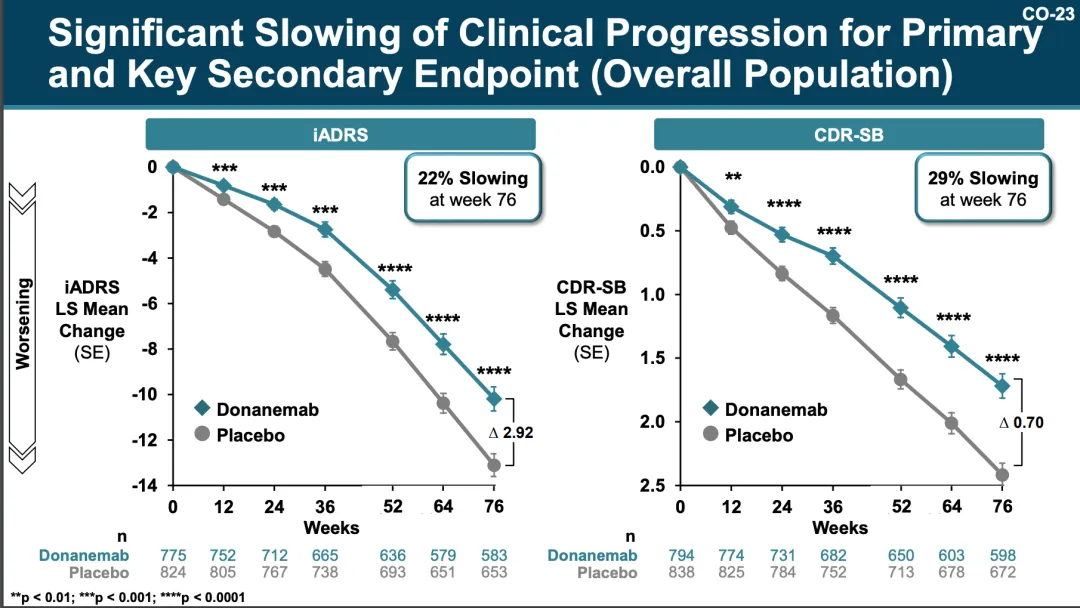 结果显示,在中低 tau 水平的受试者中(n=1182),主要终点指标 iADRS 显示 Donanemab 延缓了认知功能下降达 35%(p<0.0001),以及另一重要的关键指标 CDR-SB 评分显示 Donanemab 延缓了患者认知功能下降 36%(p <0.0001);在所有受试者(n=1736)中,分别下降 22% 和 29%。且无论疾病基线和病理阶段如何,与安慰剂相比,Donanemab 都能带来认知和功能益处。