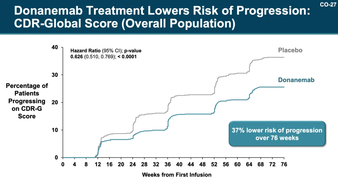 Donanemab 也将患者疾病进展至下一阶段的风险降低了 37% (HR=0.626; p<0.0001)。