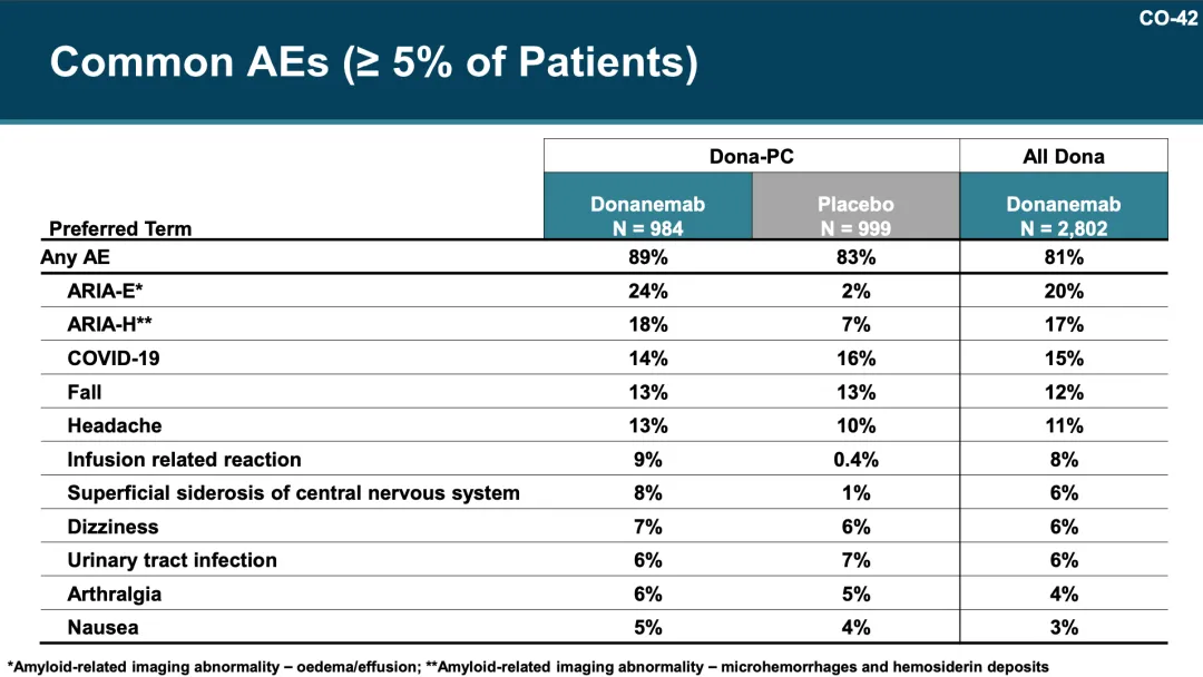 安全性方面,Donanemab 组 89% 患者出现不良事件(AE)(vs 安慰剂组 83%),常见 AE 包括淀粉样蛋白相关成像异常-水肿/积液(ARIA-E)(24%)、淀粉样蛋白相关成像异常-微出血以及和含铁血黄素沉积(ARIA-H)(18%)、COVID-19(14%)等。