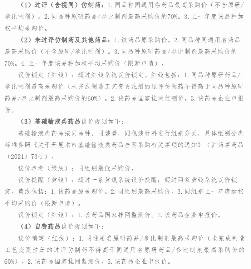 5月中旬,上海发布《关于优化本市药品挂网采购机制推动高效办成一件事的通知》,再次明确各类药品的“红黄绿线”议价细则。