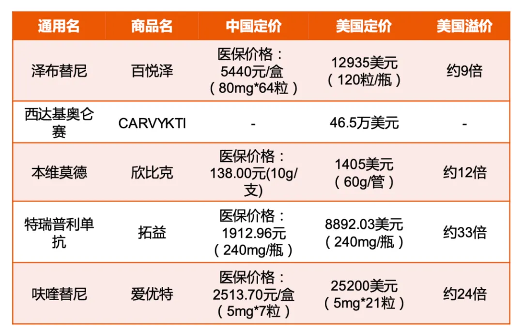 这尤其体现在创新药的定价上,例如,在美国上市以后,一盒5mg*21粒的呋喹替尼定价为2.52万美元,这一价格是国内价格的24倍。