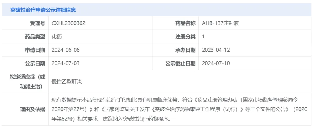 7月3日,中国国家药监局药品审评中心(CDE)官网公示,浩博医药AHB-137注射液拟纳入突破性治疗品种,针对适应症为慢性乙型肝炎。根据浩博医药公开资料,AHB-137是具有潜力成为慢性乙型肝炎“功能性治愈”基石的裸露反义寡核苷酸(ASO)药物。