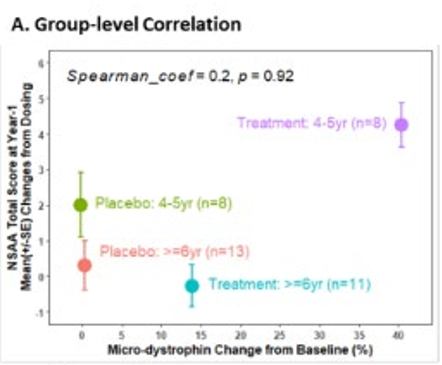 这张图沿用了aducanumab同样的分析方法。其中两个点(紫色、绿色)是4~5岁组,另两个点(蓝色、红色)是6~7岁组,X轴是替代终点微抗肌萎缩蛋白,Y轴是NSAA评分,即主要临床终点。