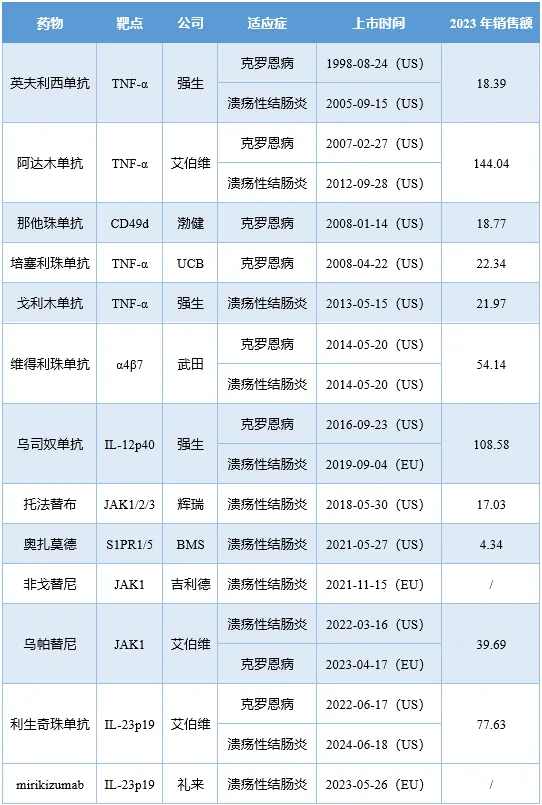 细数获批用于治疗UC、CD的药物,年销售额数十亿美元以上的重磅产品屡见不鲜。当然,这其中大多数药物也覆盖有IBD之外的更多自身免疫疾病适应症,但IBD绝对是其销售增长的核心驱动力。