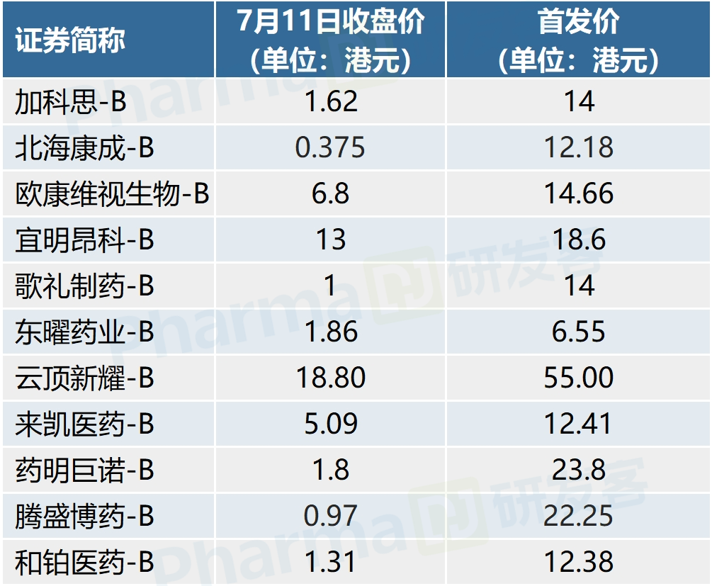 据研发客统计,自港股18A开闸以来,Biotech公司的股价较发行价平均跌去了72%(见下表)。