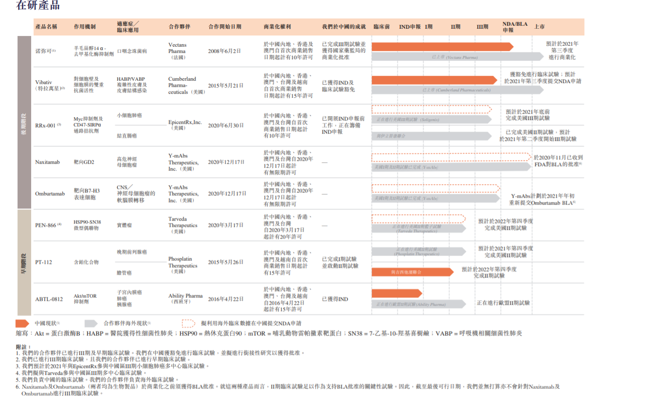 目前,公司建立了9个在研候选药物组成的产品组合,其中5个在海外处于3期或后期阶段,并将在中国采取快速上市策略,4个在海外或中国处于临床前至2期临床试验的早期阶段(信息源自赛生药业招股说明书,见下图)。