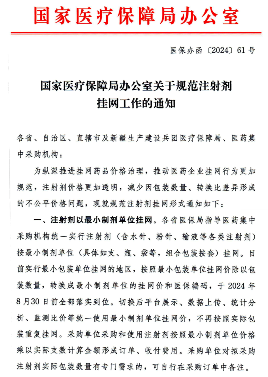 各省医保局指导医药集中采购机构统一实行注射剂(含水针、粉针、输液等各类注射剂) 按最小制剂单位(具体如支、瓶、袋等,组合包装按套)挂网。目前实行最小包装单位挂网的地区,按照最小包装单位挂网价除以包装数量,转换成最小制剂单位的挂网价和医保编码,于2024年8月30日前全部落实到位。切换后平台展示、数据上传、统计分析、监测比价等统一使用最小制剂单位挂网价,不再按照实际包装重复挂网。采购单位采购和使用注射剂按照最小制剂单位价格乘以实际支数计算金额形成订单、收付费用。采购单位对拟采购注射剂实际包装数量有专门需求的,可自行在采购订单中备注。