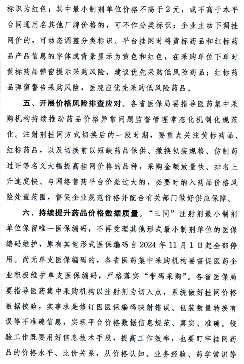 各省医保局要指导医药集中采购机构持续推动药品价格异常问题监督管理常态化机制化规范化。注射剂挂网方式切换后的一段时期,要重点关注黄标药品、红标药品,以及切换前以短缺药品保供、撤换包装规格、仿制药过评等名义大幅提高挂网价格的品种,采购金额放量快、排名上升速度快、与网络售药平台价差过大的,必要时纳入药品价格风险处置范围,督促企业规范价格并配合有关部门做好供应保障。