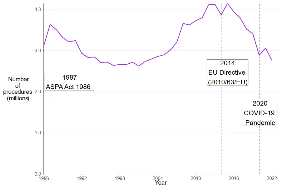 据数据显示,在一些国家,对活体动物进行的科学程序数量正在下降。在英国,2015年对活体动物进行的科学程序数量达到峰值,为414万次,而2022年仅进行了276万次此类程序,是自2004年以来的最低值。