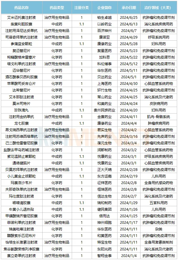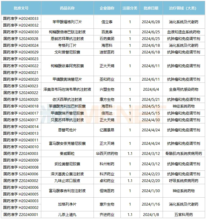 2024年1-6月国产1类新药获批情况