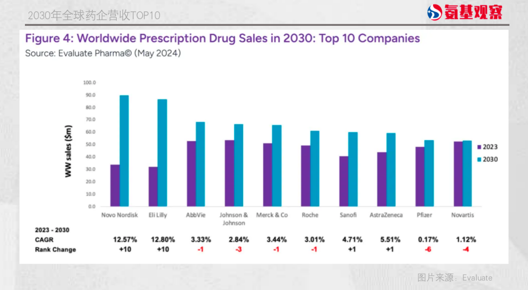 按照Evaluate的预测,2030年全球制药营收TOP10将迎来大洗牌——诺和诺德登顶,礼来第二,艾伯维第三。而此前,诺和诺德被归类为中型企业;4年前,礼来的市值还不到强生的一半。