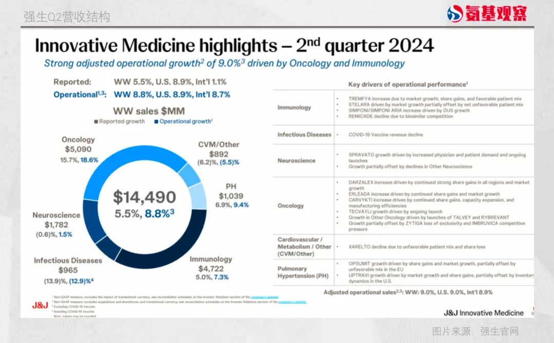从治疗领域来看,肿瘤板块增长强劲,超过自免成为强生收入最多的领域,二季度收入50.9亿美元,同比增长15.7%;达雷妥尤单抗也以55.7亿美元的收入取代乌司奴单抗,成为强生销售额最高的产品。