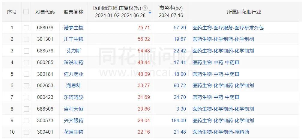 行情再差,也有“逆行者”。今年上半年,医药板块下跌了21.09%,严重跑输大盘(沪深300上涨了0.89%)。但也不乏逆势上涨的药企,比如占据涨幅榜前三的诺泰生物、川宁生物、艾力斯。