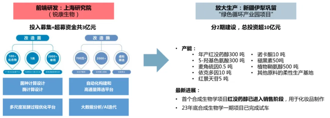 站在GLP-1风口上的诺泰生物顺势飞了起来,而站在合成生物学风口上的川宁生物,也实现了逆势上涨,今年上半年以56.32%的涨幅摘得亚军。归其原因,一则得益于消息面上,市场对生物制造政策有望近期出台的较强预期,二则这两年川宁生物已经展现出靓丽的业绩,可以实现自我“造血”,不再依赖母公司科伦药业。川宁生物是科伦药业分拆出来的两家子公司之一,另一家是ADC明星公司科伦博泰。川宁生物成立于2010年,专注于抗生素中间体业务,曾长期依赖科伦药业大手笔输血。之后,科伦药业通过为川宁生物引入战略投资者,并进行股份制改造,使其成功登陆创业板并实现业绩好转。2021-2023年,川宁生物分别实现总营收32.32亿元、38.21亿元、48.23亿元,同比增长-11.44%、18.21%、26.24%,同期归母净利润为1.11亿元、4.12亿元、9.41亿元,同比增长-51.38%、269.58%、128.56%,实现了自我“造血”。如今,川宁生物不仅成为国内抗生素中间体龙头,还站上合成生物风口,斥资10亿元投资合成生物项目,目前已有红没药醇、5-羟基色氨酸、麦角硫因、依克多因等多个产品进入生产、销售阶段,成为业内为数不多的完成了合成生物学从选品-研发-大生产的企业。川宁生物合成生物投资计划