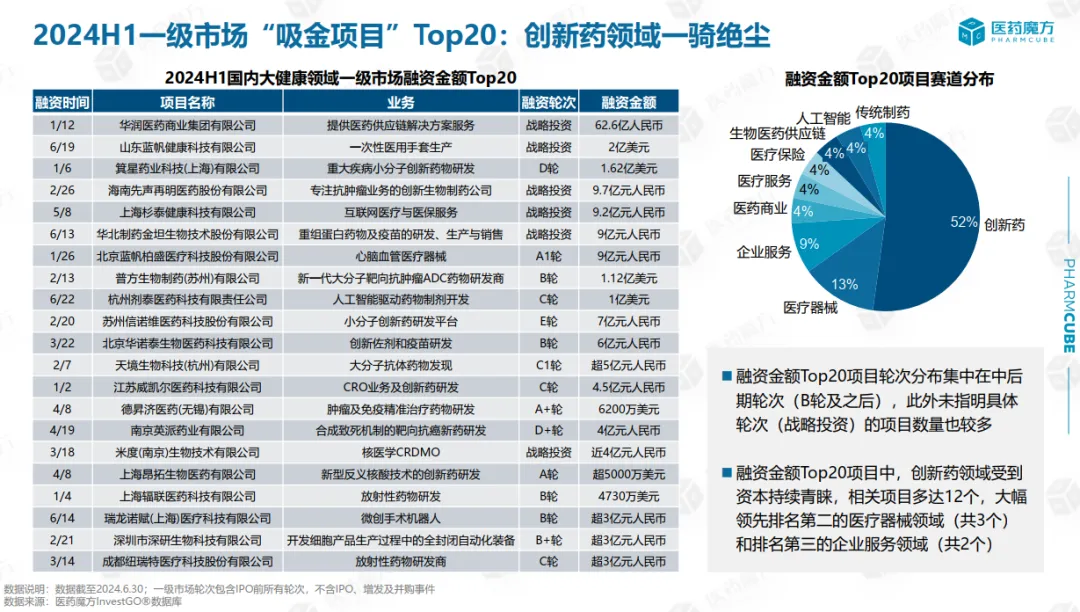 虽然从医疗健康领域投融资情况来看,整体有所下降,但具体到细分领域还是有所不同。创新药领域依旧是投资不可失的“重要阵地”,持续吸收着大部分资金。2024H1一级市场国内创新药领域融资金额21.52亿美元(约为150亿元人民币)。在融资金额“TOP20”项目中,创新药占据60%的事件数量;占据52%的金额。