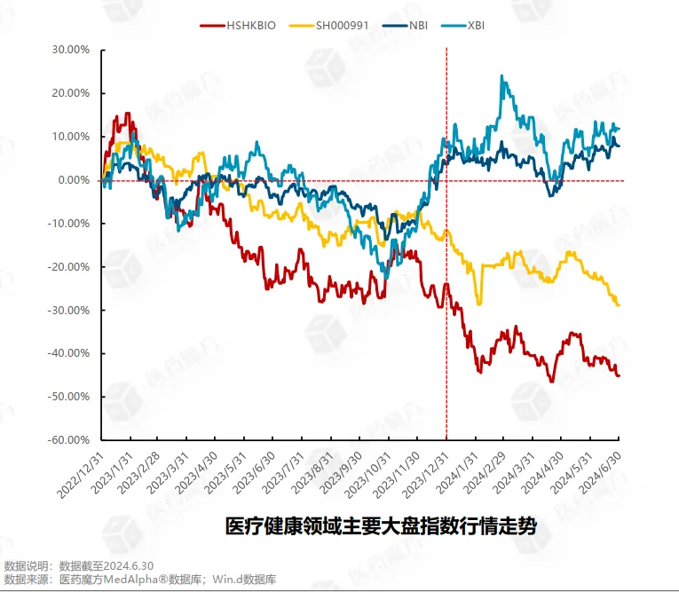 国内二级市场整体来看,依旧处于低谷期。2024年上半年,恒生香港上市生物科技指数下跌25.84%,中证医药全指指数下跌19.81%。