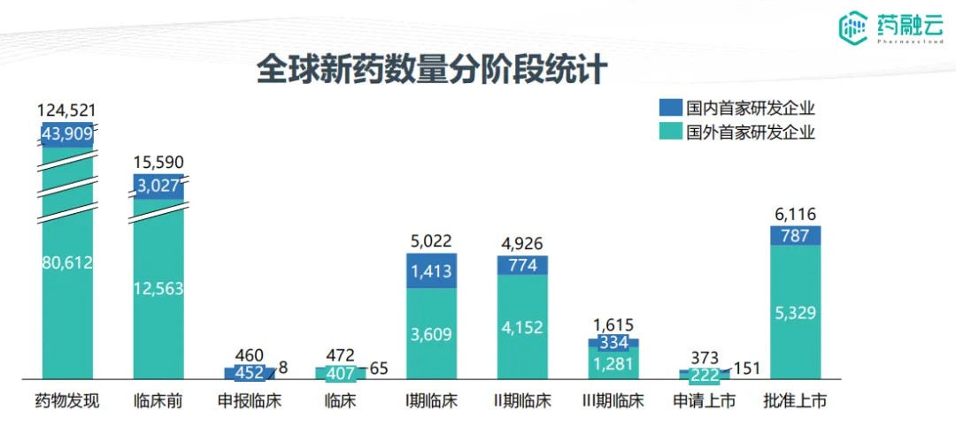 随着全球制药业正从新冠疫情的影响中走出,全球药物研发正在复苏中稳步增长。据药融云数据统计,截至2023年2月,全球新药管线总计159095个,涉及7042个靶点,16665家企业。全球新药中,药物发现和临床前药物占比最大(88.1%),IND-NDA阶段的药物占比8.1%,批准上市药物占比3.8%。全球新药中,首家研发企业为国内企业的药品总数为50912,占比32%。