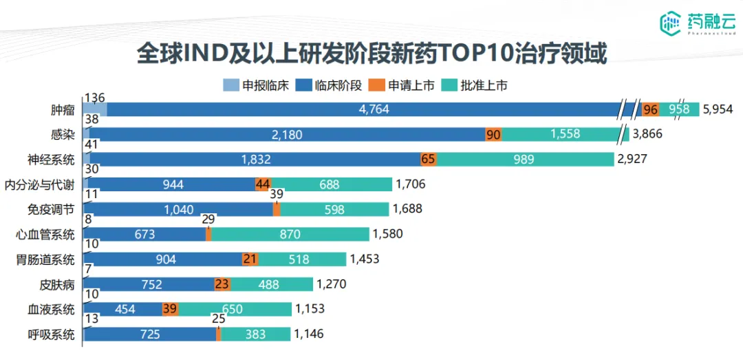 从数量上看,全球IND及以上研发阶段新药的TOP1治疗领域为肿瘤领域,肿瘤领域药品数量共计5954个。肿瘤领域中,处于临床阶段的药品数量最多,共计4764个,占比80%。