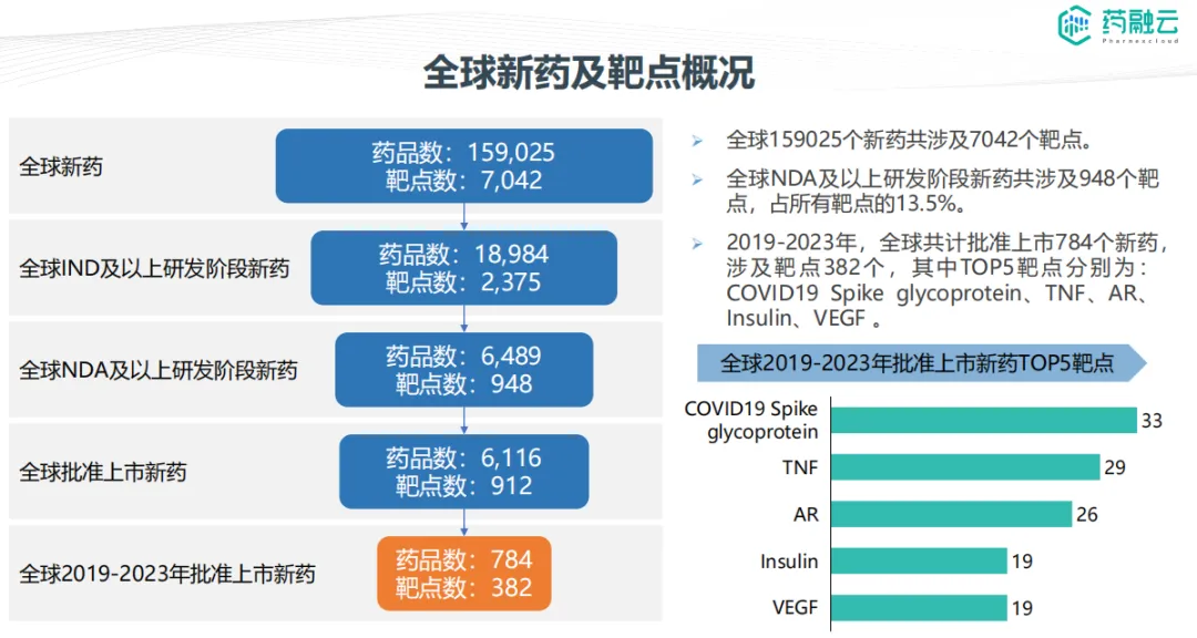 从靶点上来看,全球159025个新药管线共涉及7042个靶点。全球NDA及以上研发阶段新药共涉及948个靶点,占所有靶点的13.5%。2019-2023年,全球共计批准上市784个新药,涉及靶点382个,其中TOP5靶点分别为:COVID19 Spike glycoprotein、TNF、AR、Insulin、VEGF。